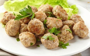 Нарізаємо дрібно 1 цибулю і 1 болгарський перець. Обсмажуємо овочі до м’якості на рослинному маслі. Додаємо до овочів 40-50 г змолотих вівсяних пластівців разом з часником і сіллю, перемішуємо. Далі додаємо 500 г фаршу, ретельно перемішуємо. З отриманої маси формуємо фрикадельки невеликого розміру. Розміщуємо їх на змащене маслом деко і відправляємо в прогріту до 200 градусів духовку на 20 хвилин.